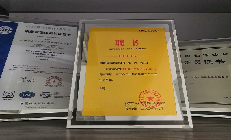 2021年8月19日,由西安市委組織部、西安市人力資源和社會(huì)保障局主辦,西安市人才服務(wù)中心承辦的第五屆西安留學(xué)回國(guó)人才招聘節(jié)在線(xiàn)啟動(dòng),我司代表被聘為“西安招才大使”。歐朗國(guó)際翻譯作為全國(guó)連鎖翻譯企業(yè),擁有15年以上翻譯服務(wù)經(jīng)驗(yàn),一直致力于培養(yǎng)高素質(zhì)的翻譯技能人才,希望歸國(guó)的優(yōu)秀人才能被吸納進(jìn)來(lái)。歐朗國(guó)際翻譯,溝通世界,連接你我!