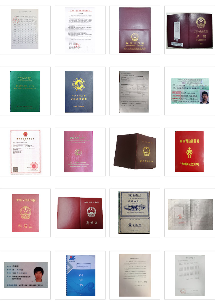 各類公證書、委托書、出國材料、合同公證、錄取通知書、在讀證明、學(xué)歷證書、學(xué)歷證、學(xué)位證書、學(xué)位證、學(xué)歷公證、畢業(yè)證、畢業(yè)證書、會(huì)計(jì)證、成績單、戶口簿、證明材料、死亡證明、身份證、單身證明、健康證、許可證、營業(yè)執(zhí)照、護(hù)照、駕照、簽證、移民、移民材料、移民資料、邊境證、出入境證件、結(jié)婚證/離婚證、婚姻證明、無犯罪證明、出生證、資格證書、涉外公證、委托公證、收入證明、房產(chǎn)證等等。